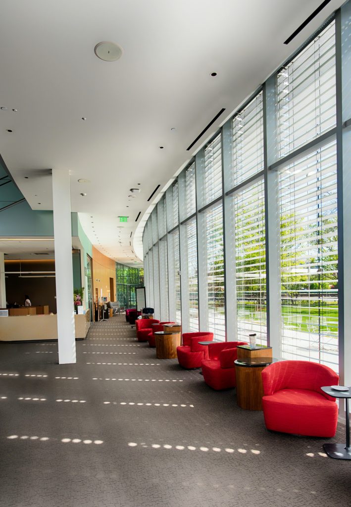 The large windows let in ample natural light, enhancing the spaciousness and providing views of greenery outside.